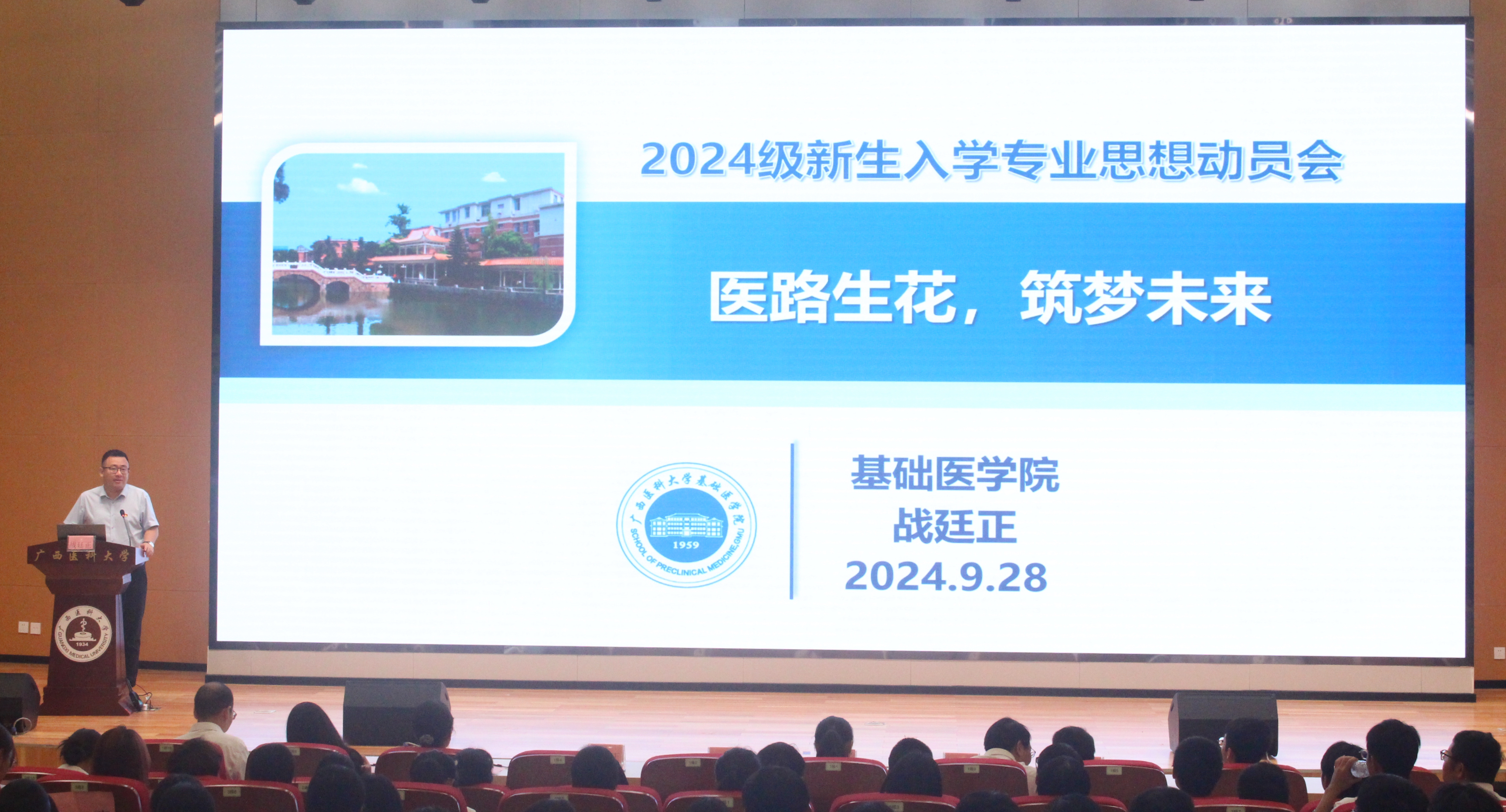 战廷正副院长作专业介绍。他从“医学是什么”“医学学什么”“医学怎么学”“老师的寄语”四个方面为同学们答疑解惑,结合医学前沿成果,加强新生对医学专业的了解与认同。