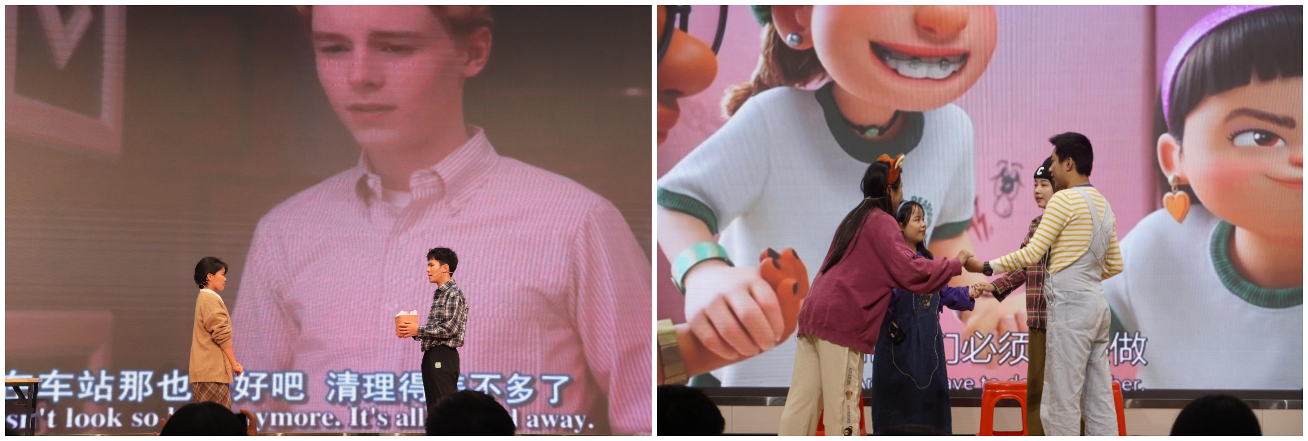 比赛中,选手们凭借清晰的发音、充沛的感情、恰当的语调成功演绎了配音片段中的人物情绪,复现了经典桥段的剧情氛围,让在场观众身临其境,精彩表现给现场评委和观众留下深刻印象。评委们从英语发音、角色模拟、舞台表现、作品选择等方面,给予每组选手细致专业的指导和点评。经过激烈比拼,大赛最终决出团体一等奖5个、二等奖9个、三等奖25个,最佳优秀个人2名。