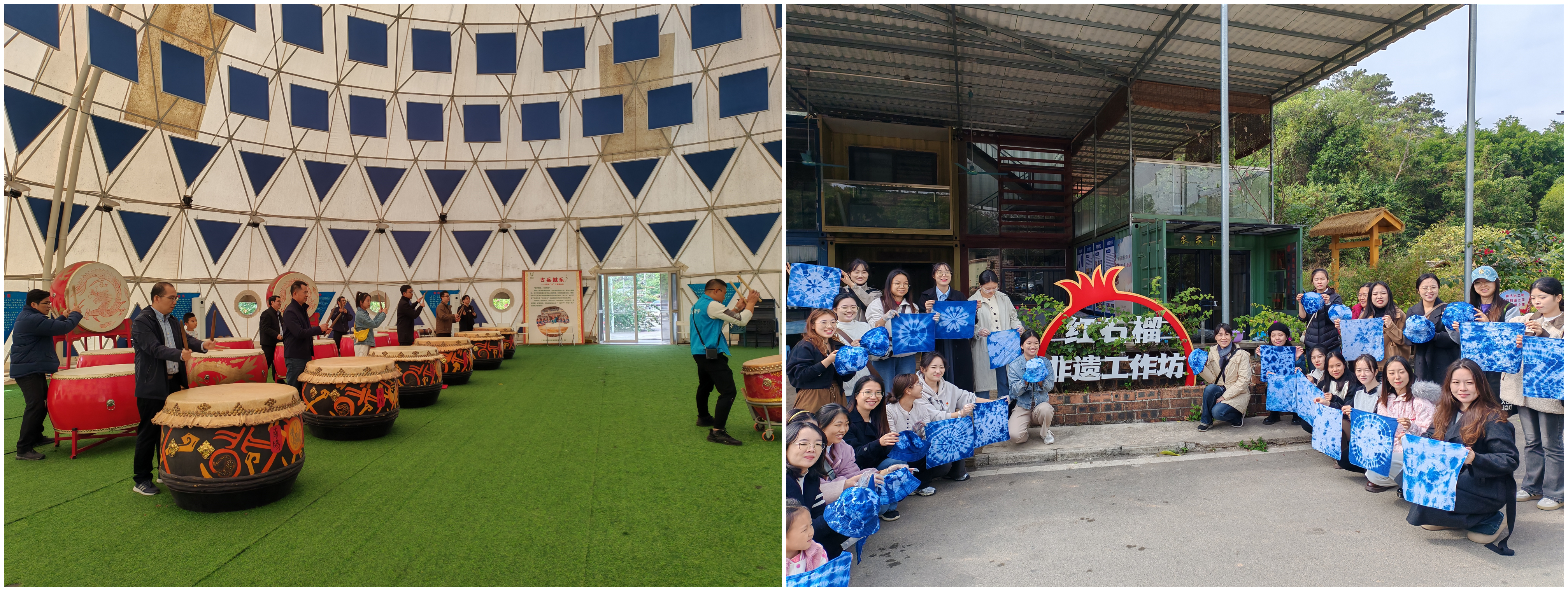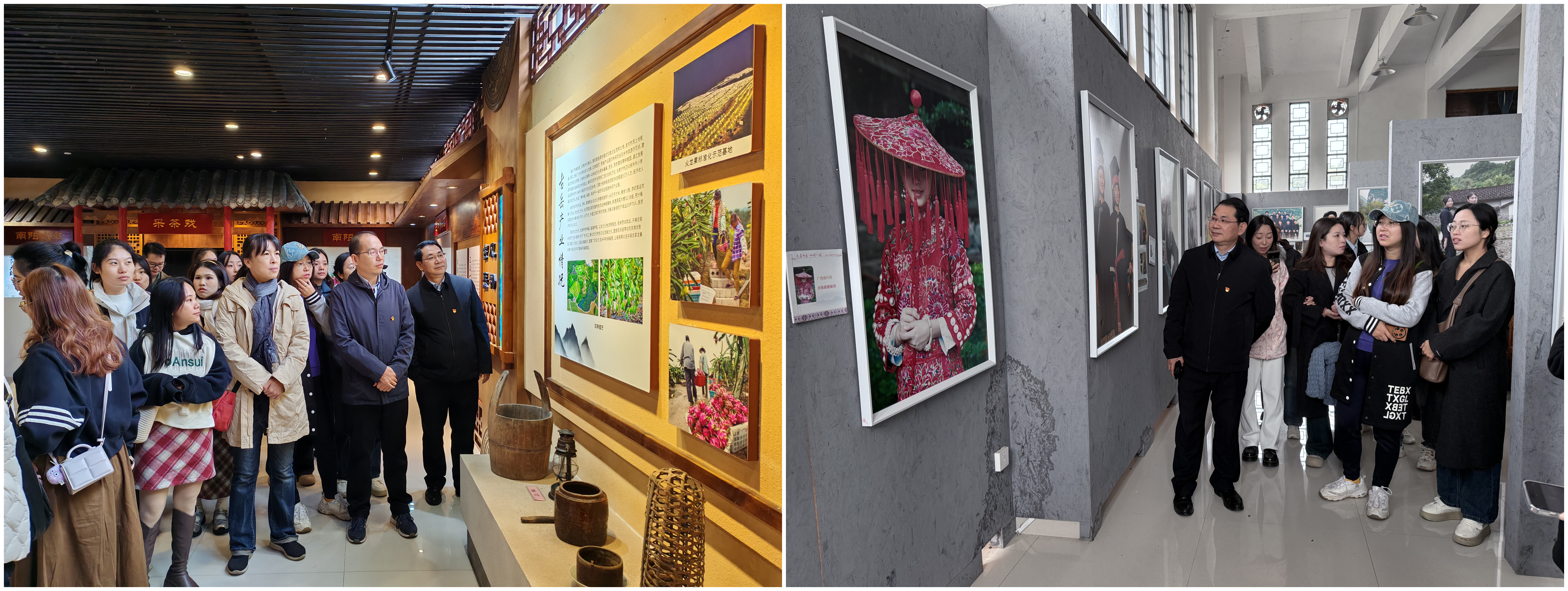 师生们依次集中参观了民俗文化展示厅、少数民族艺术家工作坊和南阳大鼓研学体验馆。通过聆听讲解、观看图文介绍和实物展陈,大家了解了古岳坡在民族文化传承发展方面的生动实践,回顾了壮族文学艺术家古笛在壮乡文学艺术上的探索和成就,同时也感受了民族文化研究者梁汉昌在广西民族服饰文化研究上的突出贡献。集中参观后,师生们分别开展了民族文化研学实践,深切感悟民族文化的魅力。