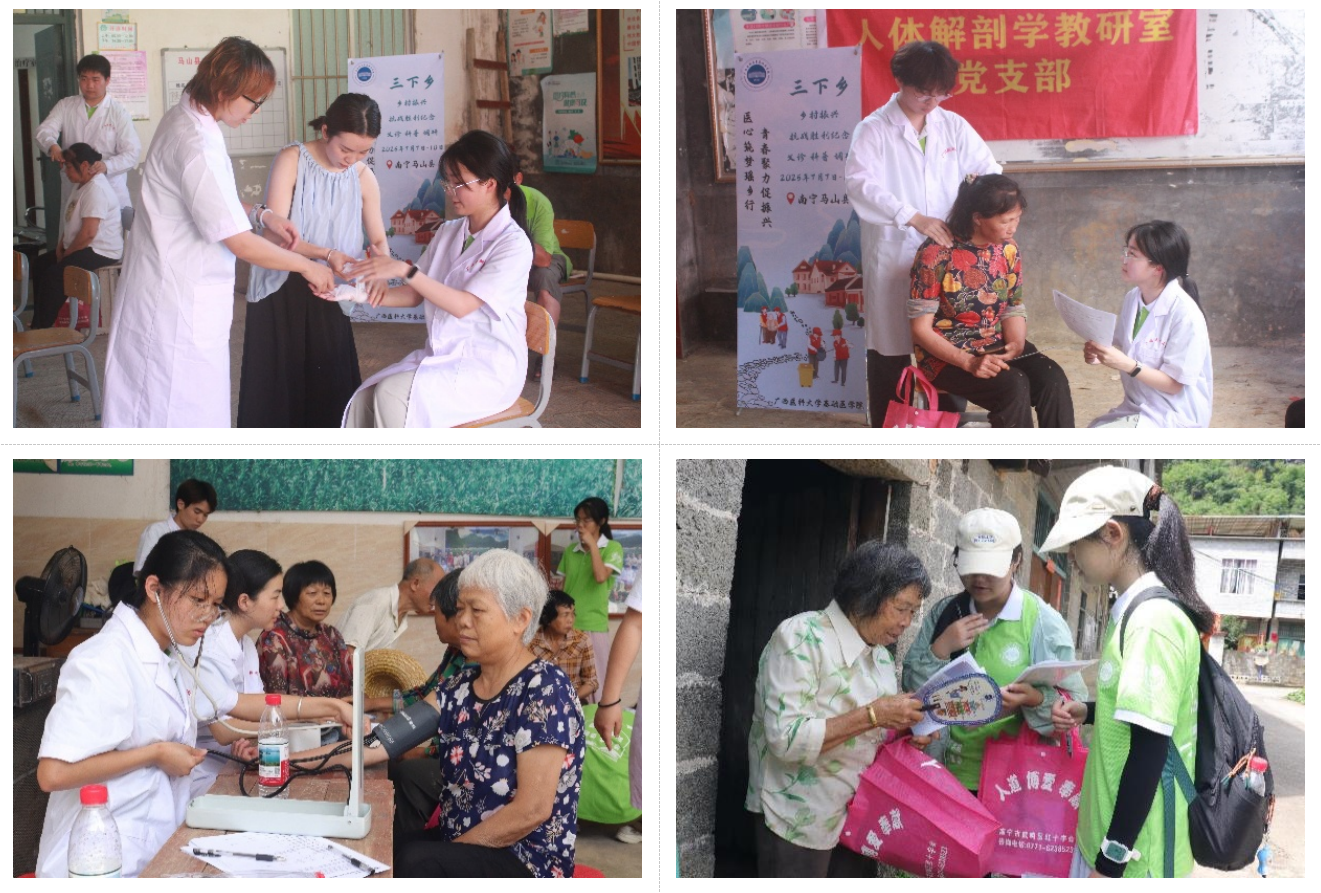 为响应国家“健康中国”战略和乡村振兴战略号召,引导医学生在实践中锤炼专业技能、厚植家国情怀。2025年7月7日至7月10日,国产精品 团委学生会联合教育部首批“全国高校黄大年式教师团队”人体解剖与组织胚胎学教师团队代表组成乡村振兴实践团赴南宁市马山县开展暑期“三下乡”社会实践活动。