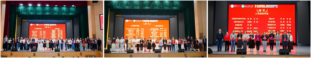 作为国内基础医学实验教学领域的顶级赛事,本届大赛由高等学校国家级实验示范中心联席会基础医学组等权威机构联合主办,吸引了全国各大高校参与。经过初赛,来自73所高校的150余支队伍晋级决赛。大赛采用高强度限时赛制,从学科知识体系、教学设计、创新思维、临场应变到实验操作能力进行全方位考核,竞争尤为激烈。在比赛中,学院教师凭借扎实的教学功底与出色的临场发挥脱颖而出:黄丽仟、林圣钧荣获人体解剖学组银奖,陈俞婷、杨孟雨荣获机能学组银奖,岳晓阳、马步国荣获组织学与胚胎学组铜奖,多点开花的成绩印证了学院实验教学的全面实力。