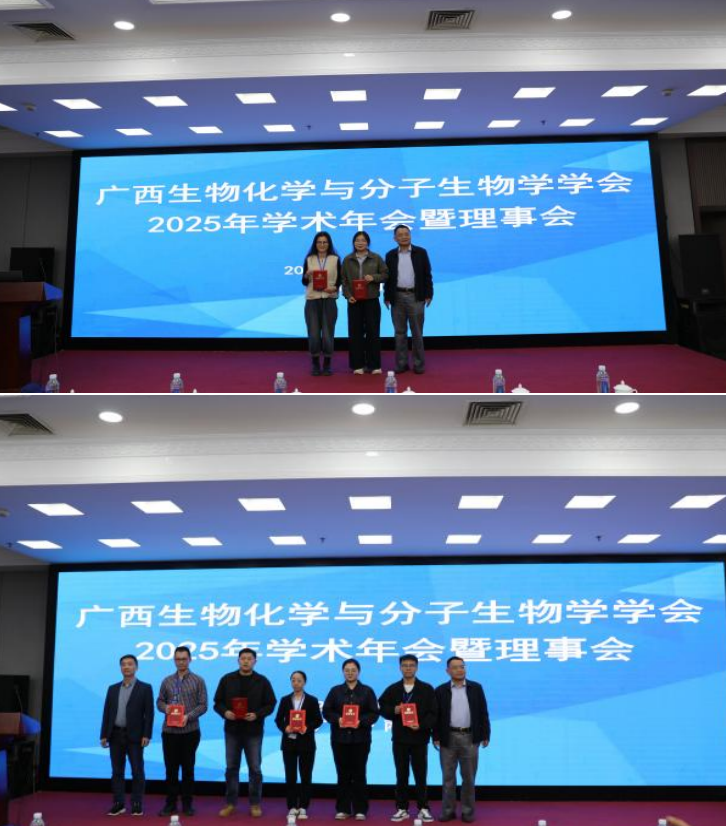 2025年11月30日,广西生物化学与分子生物学学会2025年学术年会暨理事会在南宁顺利召开。学院生物化学与分子生物学教研室师生在本届年会中表现优异,一举夺得两项赛事一等奖,展现了教研室扎实的学术功底与强劲的科研创新活力。
